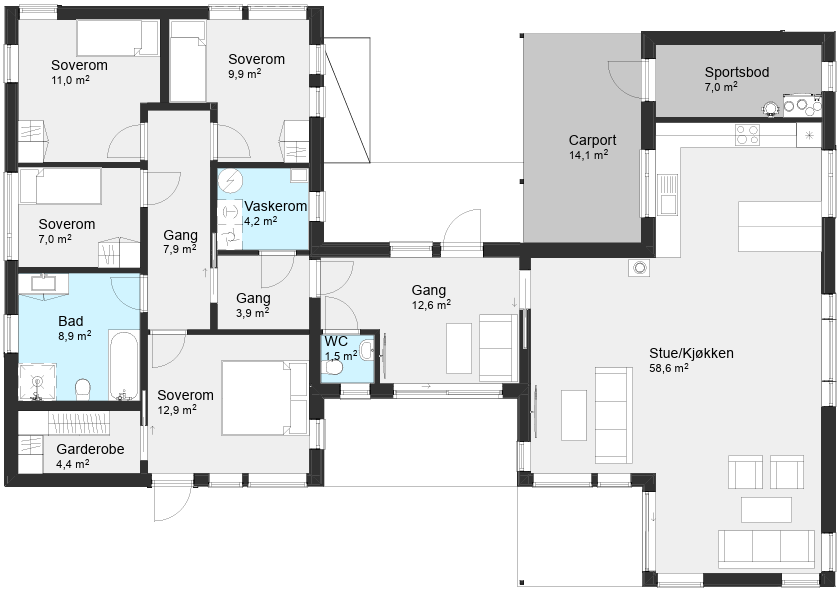 Boligen på 158 m² rommer hele fire soverom, bad, vaskerom og en stor åpen stue- og kjøkkenløsning. Her er det god flyt mellom rommene, og kort vei fra carport til sportsbod gjør det enkelt å organisere hverdagen.