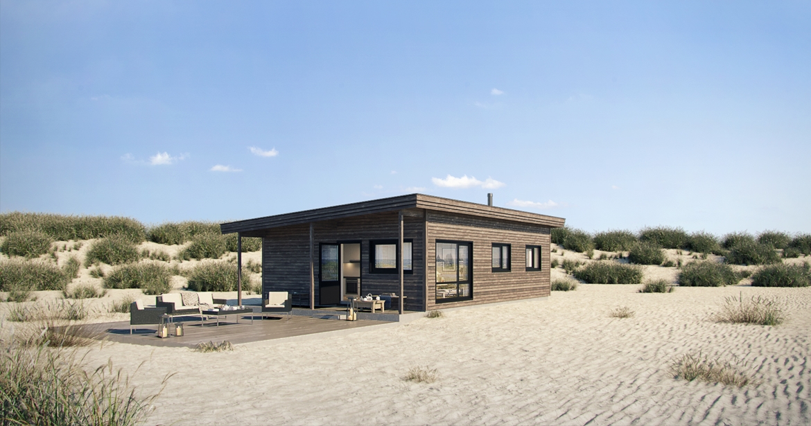 Sande har en planløsning som gir stort volum på liten flate. Lyst oppholdsrom og overbygde utearealer skaper mange steder for avslapning i naturlige omgivelser.